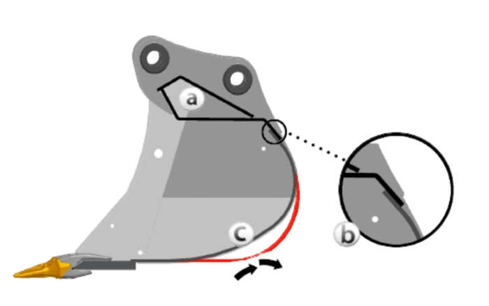 - Dual Radius shape increases heel clearance reducing drag and wear (red line being a non dual radius design where the bottom of the bucket can drag against the ground more on digging) (c)